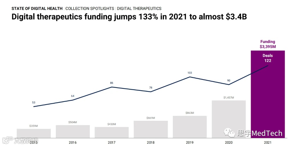 根据CBInsights的数据,2021年数字疗法全球市场规模达到34亿美元,较前一年增长133%。