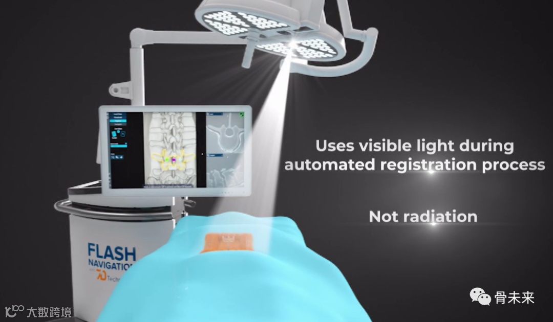 FLASH™导航采用了一种基于相机的新型专利技术,再结合机器视觉算法(可实现快速、准确、高效和不间断的手术工作流程),使得手术环境安全无辐射。可见光技术能够在短短几秒内实现FLASH配准,并提供独立的椎体配准,从而获得高系统精度,不再受患者定位或术中移动影响。
