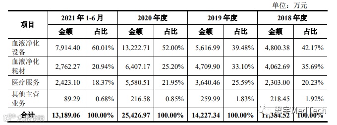 从产品结构分析,报告期内公司主要产品和 服务包括血液净化设备、血液净化耗材、医疗服务三大系列,合计占比分别为 98.08%、98.17%、99.15%、99.32%。其他主营业务主要为零配件、透析用制水设备的销售及技术服务、维修服务等,收入占比较小。