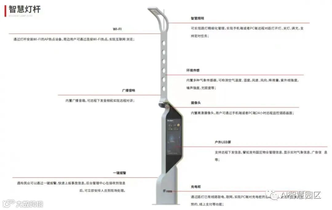 集照明、屏幕信息发布、广播、感应器、WiFi、环境监测、高清视频监控、紧急呼叫等多种功能于一体,实现集约化管理。