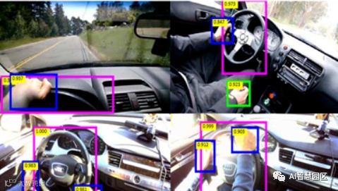 我们首先检测方向盘、手机、人手这三个目标,然后通过检测框位置信息,通过几何运算得到目标的质心坐标,判断不同目标质心距离从而判断驾驶员在驾驶过程中是否进行规范驾驶,即在驾驶过程中是否玩手机,手是否放在方向盘上。