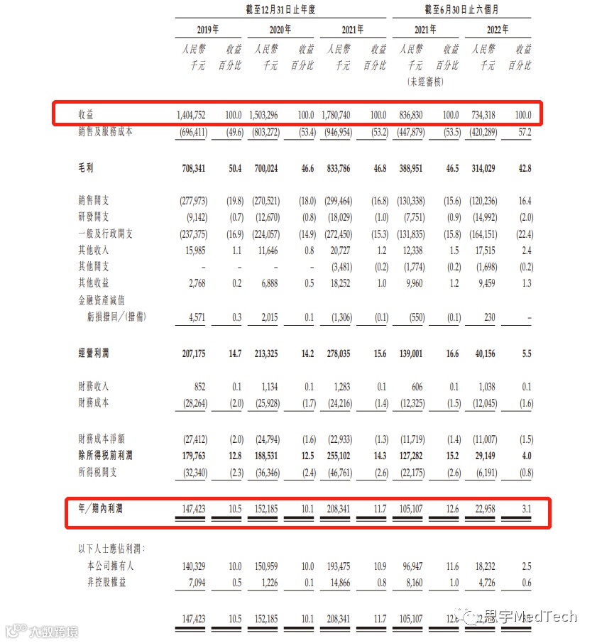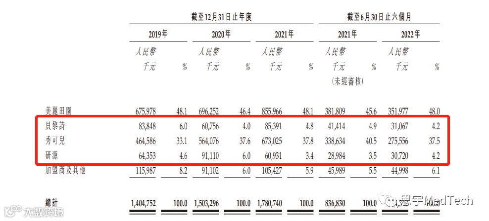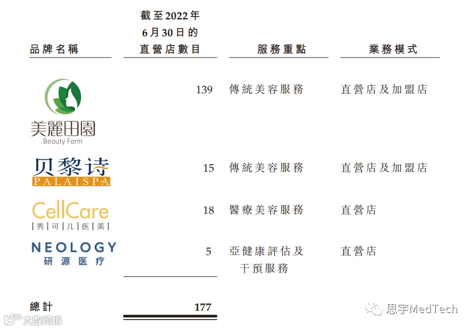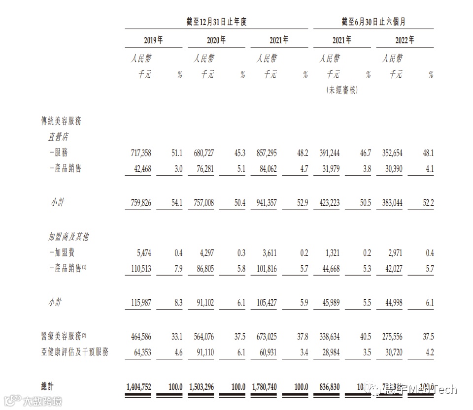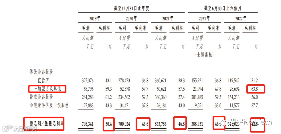 在毛利率方面,2019年、2020年、2021年以及截至2021年及2022年6月30日止六个月,美丽田园医疗毛利率分别为50.4%、46.6%、46.8%、46.5%及42.8%。直营店提供的传统美容服务是服务项目的最大组成部分之一,其毛利率2019年、2020年、2021年以及截至2021年 及2022年6月30日止六个月分别为43.1%、36.8%、38.3%、36.8%及31.2%。值得注意的是今年上半年加盟店及其他服务毛利率达到63.8%,加盟店及其他的毛利率远高于直营店的毛利率。