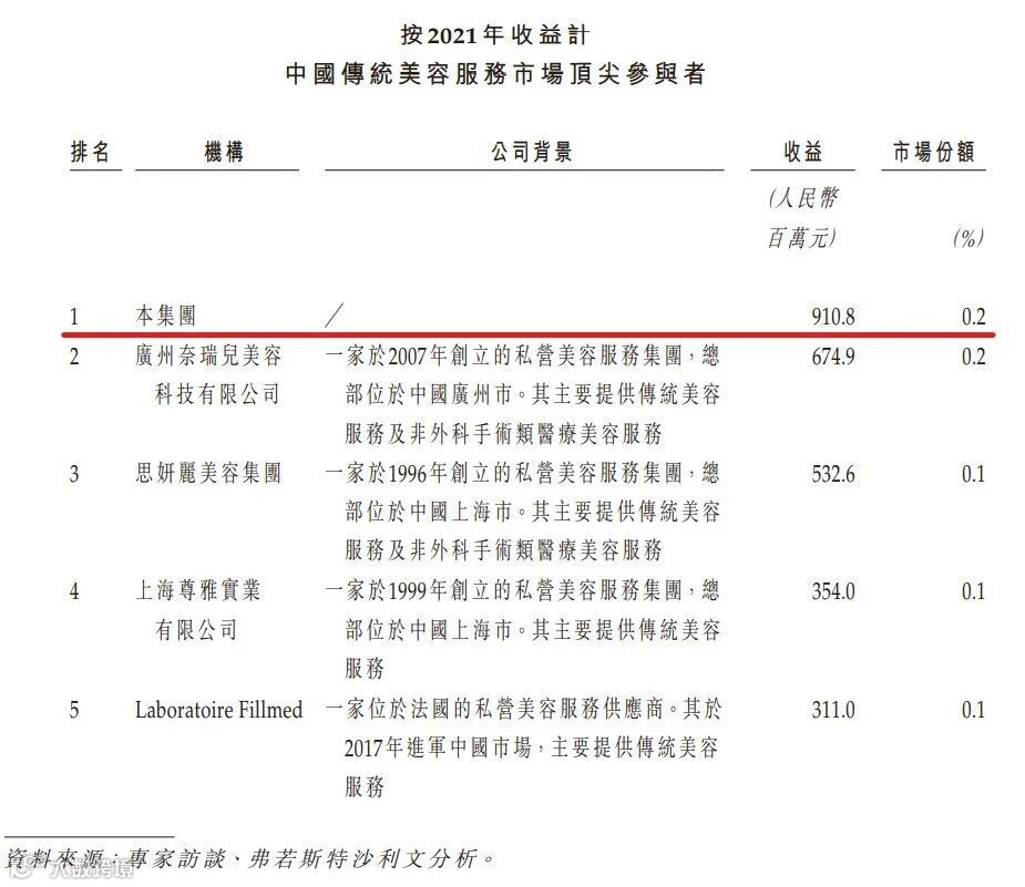 招股书显示,中国传统美容服务市场的市场参与者主要包括国内及国际传统美容服务提供商,其于中国设有独立及连锁门店。在分析传统美容服务市场的顶尖市场参与者时已考虑所有该等市场参与者。如下表所示,按来自直营店传统美容服务的收益计,美丽田园于2021年在中国竞争对手中排名第一。