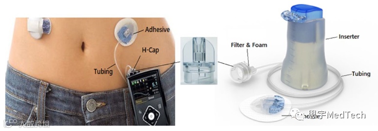 该产品主要由5部分组成:内嵌PVA泡沫、管路过滤器、多层医用导管、胶粘剂贴片、插入角度为90°的软特氟隆套管和具有自动回针功能的插入装置(来自Mio Advance (510k K173879))。