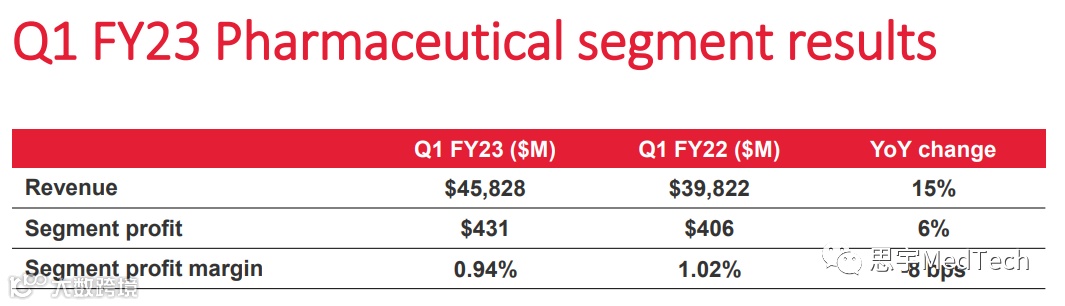 嘉德诺制药部门的收入增长了15%,总营收为458亿美元,其中利润增长了6%,达到4.31亿美元。主要是来自品牌药品销售的增长,部分被通货膨胀的供应链成本抵消。