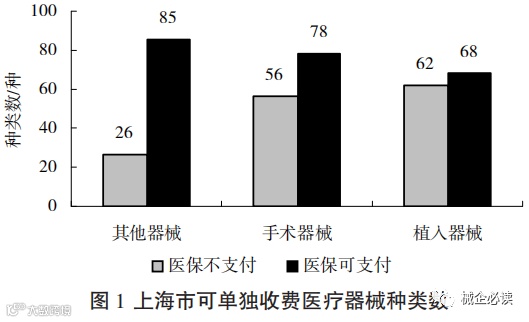 上海市医保可支付的医用材料分为诊疗设备、一次性使用和植入型人工器官和医用材料两大类。根据《可另收费的一次性使用医疗器械目录》,可单独收费的医疗器械分为植入器械、手术器械和其他器械三大类,共计375种(见图1),其中医保可支付231种(除高值耗材外,以导管、支架、敷料、各类配件为主),支付方式主要为按比例支付和定额支付。