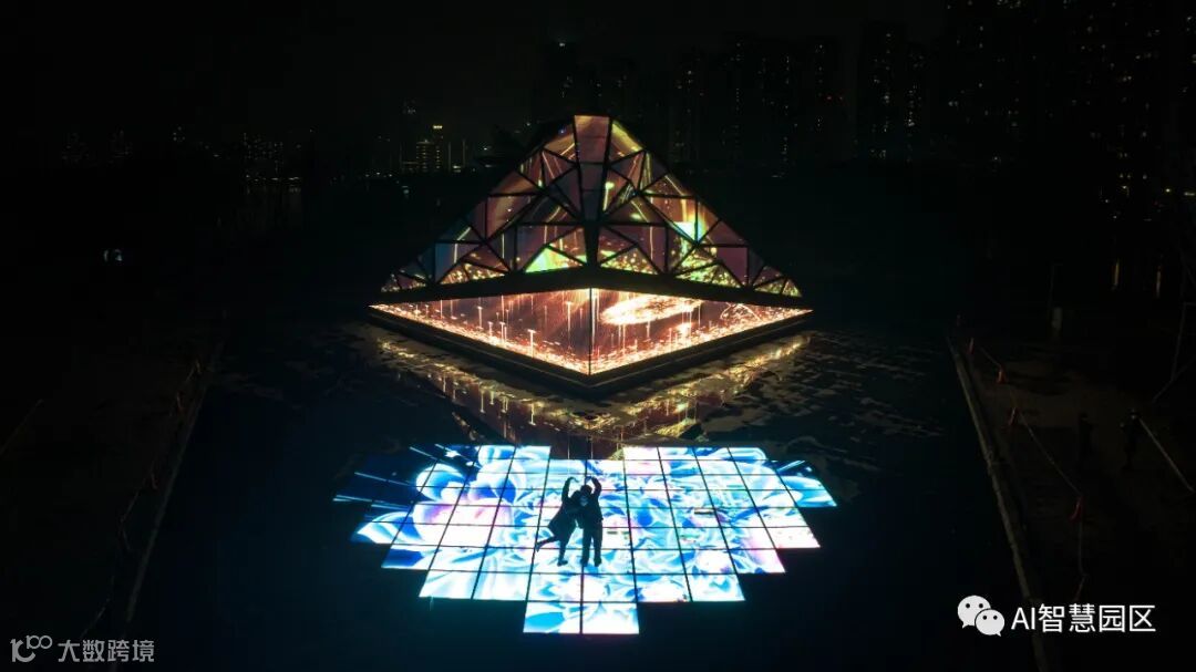 钻石宫顶部贴满幻影贴膜屏幕,天空、地面、水面、三者交互,达到“钻石天幕”的光影特效与智慧互动体验。