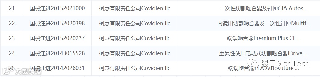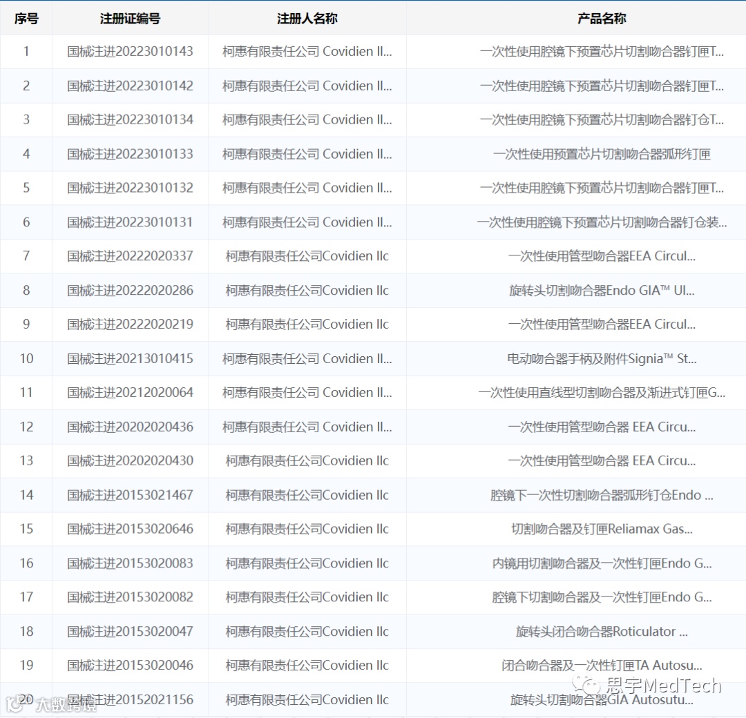 截止思宇发稿日,据查询NMPA官网,美敦力旗下柯惠有25款获批进口吻合器产品。