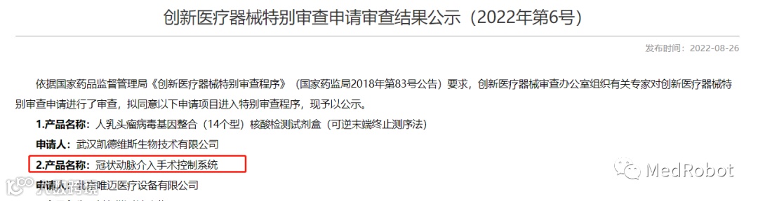 近日MedRobot关注到国内血管介入手术机器人公司唯迈医疗的产品已进入创新通道(公示期截止于9月10日),期待更多新进展。