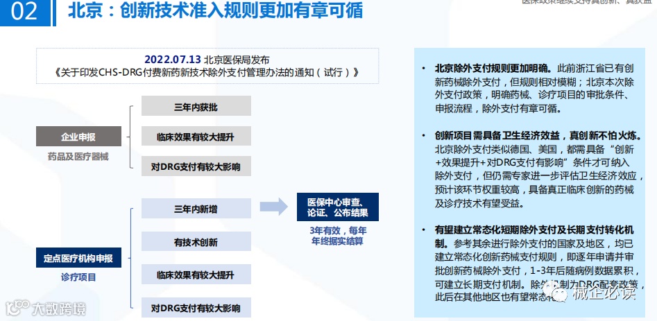 2022年7月13日,北京医保局发布《关于印发CHS-DRG付费新药新技术除外支付管理办法的通知(试行)》,使我国创新技术准入规则更加有章可循,并且有望建立常态化短期除外支付及长期支付转化机制。