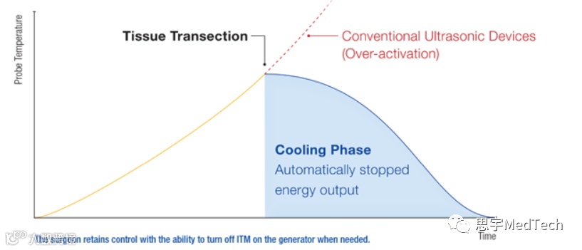 值得一提的是,Thunderbeat还采用了智能组织监测(ITM)技术,以用于手术过程中的温度管理。这也是超声波切割设备唯一采用的自动停止技术,该技术通过调节能量输出对变化的组织状况作出反应,以改善温度管理,同时可以在切割完成后自动关闭能量输出,使得机器进入冷却阶段。