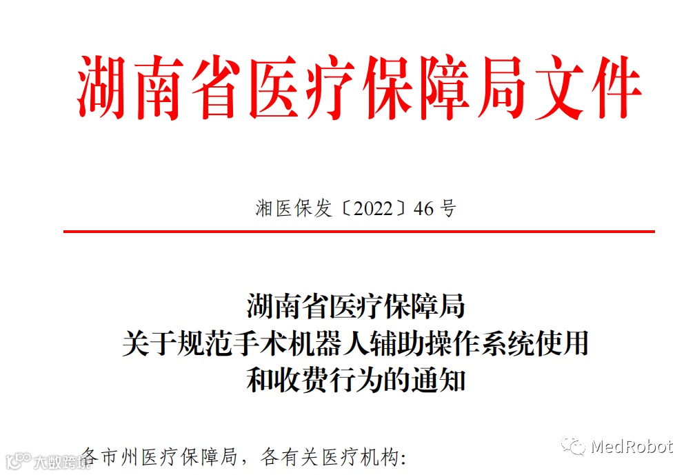 在手术机器人行业交流群中,传出了《湖南省医保局关于规范手术机器人辅助操作系统使用和收费的通知》文件。