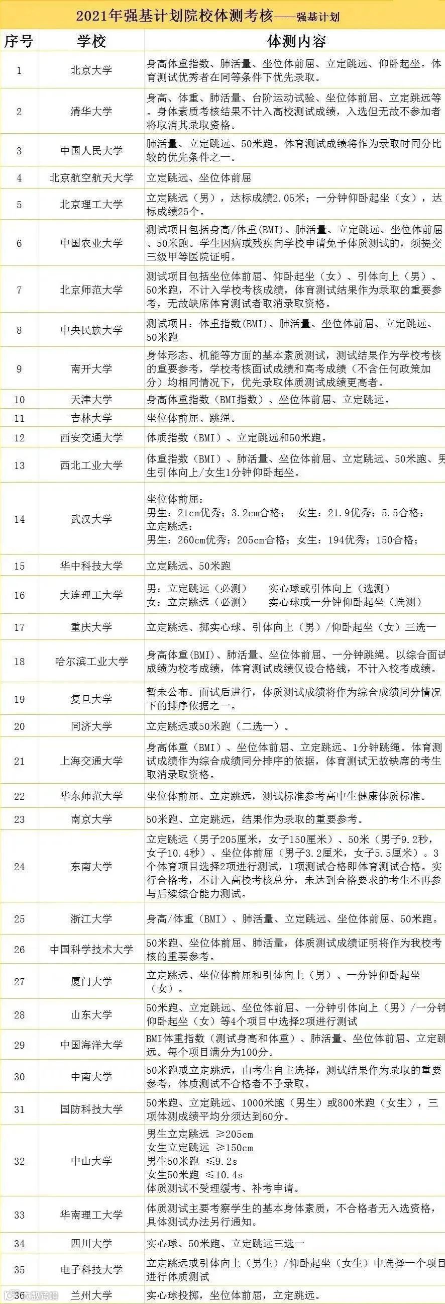体育纳入高考,考什么?怎么考?我们整理了36所首批强基试点高校体测信息,排名不分先后,供大家参考!