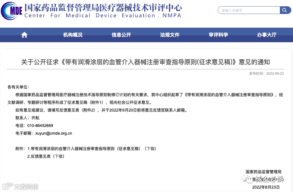 2022年8月23日,国家药品监督管理局医疗器械技术审评中心发布关于公开征求《带有润滑涂层的血管介入器械注册审查指导原则(征求意见稿)》意见的通知,意见或建议,须在2022年9月20日前反馈。