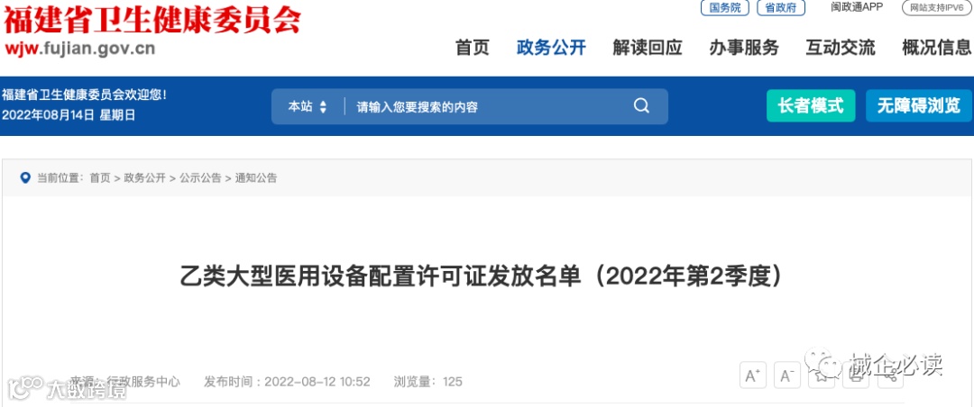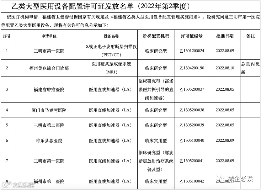 2022年8月12日,福建省卫健委发布《乙类大型医用设备配置许可证发放名单(2022年第2季度)》!