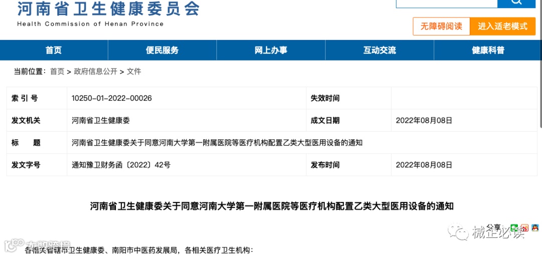 2022年8月8日,河南省卫健委发布《关于同意河南大学第一附属医院等医疗机构配置乙类大型医用设备的通知》。