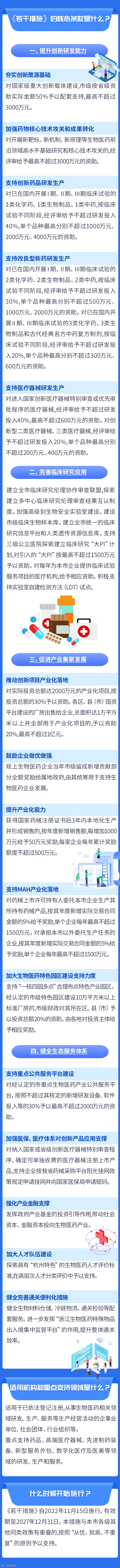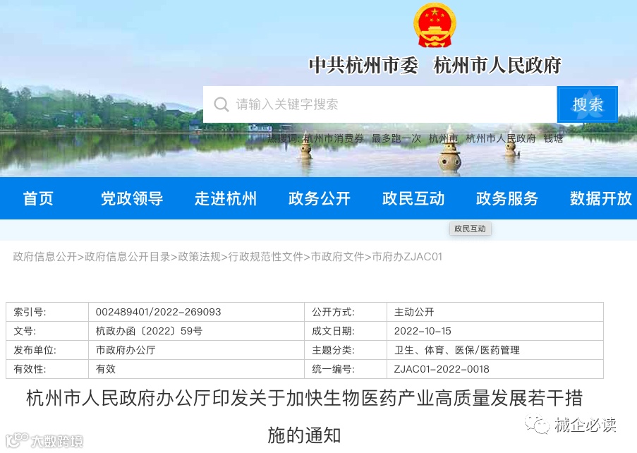 2022年10月15日,杭州市人民政府办公厅印发《关于加快生物医药产业高质量发展若干措施的通知》,本措施自2022年11月15日起施行,有效期至2027年12月31日,由市促进生物医药产业创新发展领导小组办公室负责牵头组织实施。