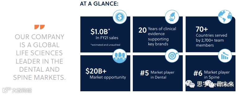 ZimVie 2021年营收10.69亿美元,按该数据,据公司报道,在脊椎领域市场份额全球第六位,牙科领域市场份额全球第五位,具有非常大的成长空间。牙科业务2021年总营收为4.69亿美元,业务包括种植牙、生物材料和数字牙科三大板块。而其中生物材料方面居全球第二,业务遍布全球70余个国家;在脊柱业务领域,尤其是颈椎间盘置换领域处于市场领先地位,提供旨在满足外科医生及其患者需求的广泛脊柱产品组合,产品销售遍布全球50余个国家,2021年脊柱业务营收5.4亿美元。