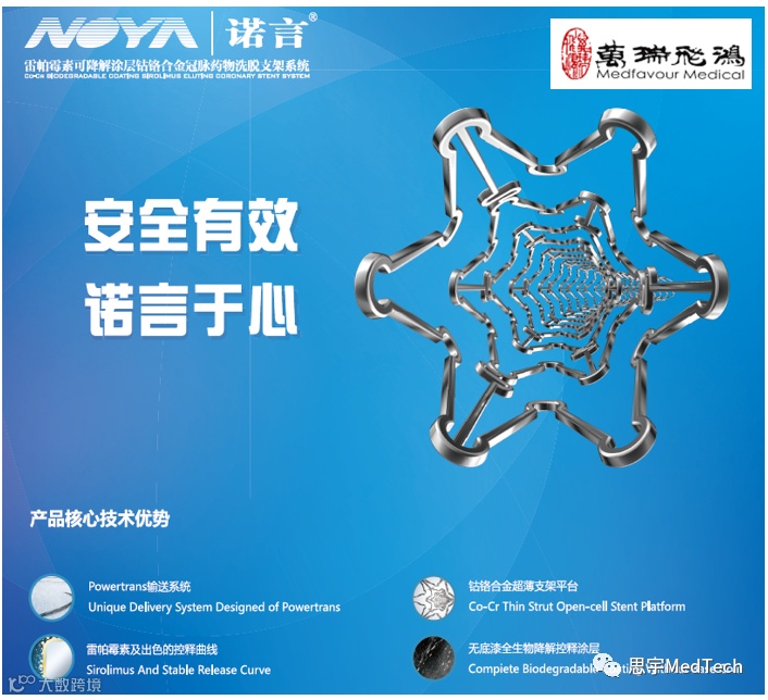 NOYA(诺言)冠状动脉钴铬合金可降解涂层雷帕霉素药物洗脱支架系统(以下简称NOYA支架),是万瑞飞鸿自主研发生产的新一代药物洗脱支架。现有循证医学证据已证实,其近期和远期疗效及安全性都较为理想。根据长达一年的临床实验表明长期的临床随访,NOYA支架的有效性和安全性得到了验证:心源性死亡、心肌梗死的发生率仍为4.7%,没有新增加的不良事件,无血栓发生。