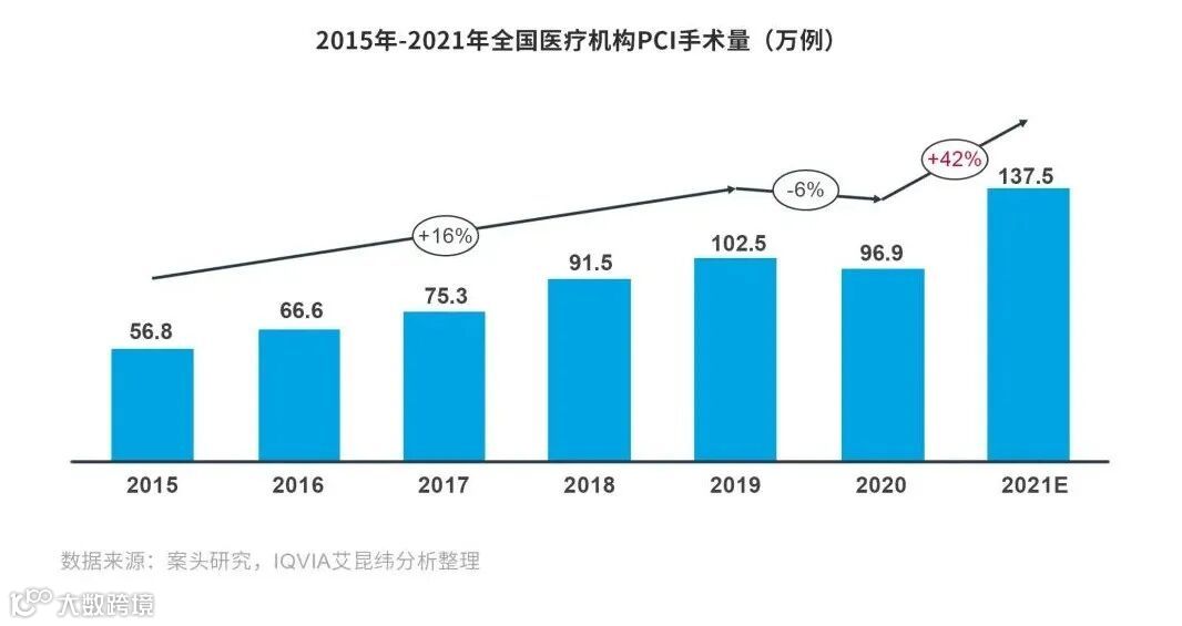 根据咨询机构IQVIA艾昆纬的分析,集采推动PCI手术在短期内快速放量。在带量采购前,支架费用是PCI手术中器械费用的主要组成部分,可占手术费用的30%以上。带量采购后,患者对PCI手术的可负担性大大提升,促使PCI手术在中国加速普及。2021年中国PCI手术量相比2020年增长超40%,而疫情前的2015-2019年,PCI手术量的年均复合增速仅为16%。