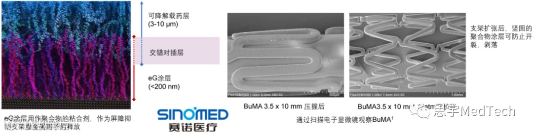 赛诺医疗的业务聚焦在冠状动脉支架系统和球囊扩张导管两大类。其BuMA Supreme冠脉药物洗脱支架系统,作为中国首个在品质上能与国际领先产品同台竞技的高端产品,在产品设计、涂层工艺及临床获益方面具有明显优势。采用了钴铬合金支架,支架壁厚降至80微米。其内皮覆盖率也达到80%,有望大幅缩短术后抗凝药物服用时间。