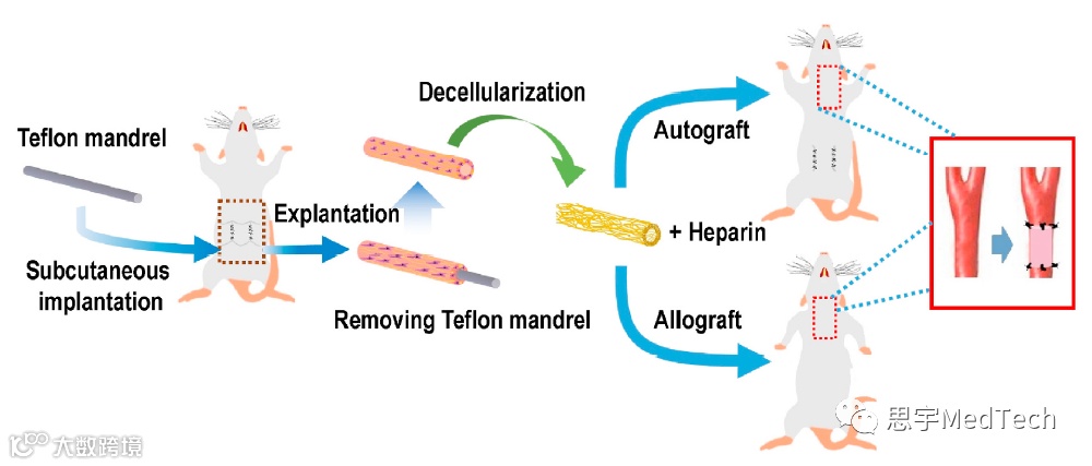 源于美国加州旧金山分校Song Li组的研究表明,自体产生的支架在临床上有非常高的应用潜力。研究者们在小鼠腹腔内植入了一根生物惰性的铁氟龙圆柱,圆柱的外侧因小鼠自身免疫反应而形成了一个纤维囊。再将此纤维囊去细胞化处理之后,这就变成了一个纤维导管,也可以称之为一个自体生物支架(如下图)。当把这个自体生成支架嫁接在同一个小鼠的动脉血管上,这个支架将会带来较高的相容性和功能性。具体表现为:支架多由细胞外基质(例如:胶原蛋白)免疫反应较低,钙化程度低,能够招募自身细胞富集并形成完整的内皮细胞,并且拥有很高的血管通畅性。