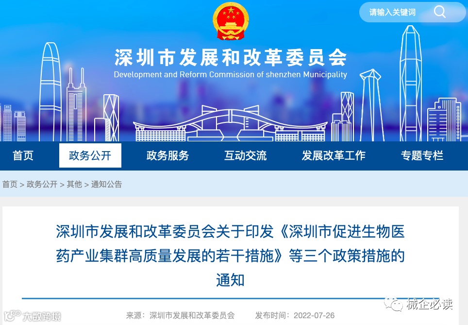2022年7月26日,据深圳市发展和改革委员会公告消息, 深圳市发展和改革委员会印发《深圳市促进高端医疗器械产业集群高质量发展的若干措施》(以下简称《措施》)。