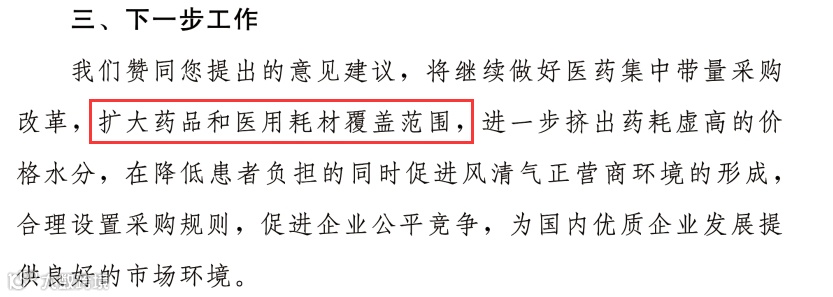 文中表示,接下来将继续做好医药集中带量采购改革,扩大药品和医用耗材覆盖范围。
