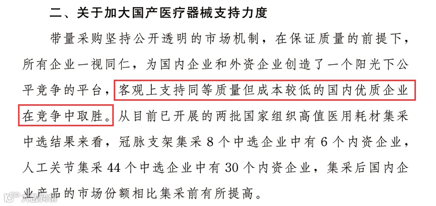国家医保局表示,带量采购在保证质量的前提下,所有企业一视同仁。在这个公平竞争的平台上,客观上支持同等质量但成本较低的国内优质企业在竞争中取胜。