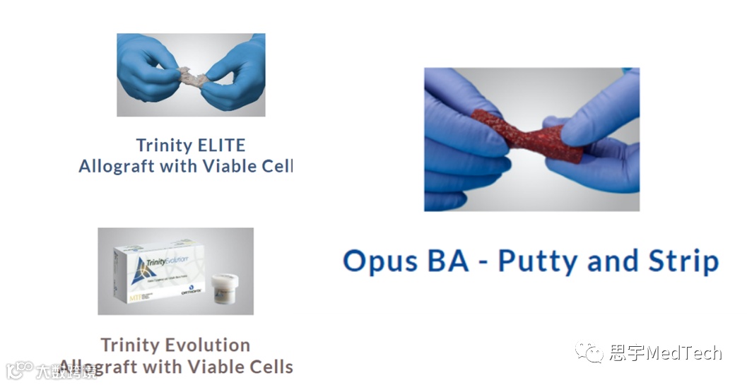 Orthofix的生物活性合成材料在许多外科应用中发挥着重要作用,这些合成材料包括具有活细胞的同种异体移植物、结构性同种异体移植物、脱矿质骨基质、合成骨移植物和羊膜,通过提供骨愈合所需的关键元素,为骨骼生长创造了理想的环境,从而刺激骨形成、生长和吸收营养物质。Orthofix领先的同种异体骨移植产品——Trinity ELITE™ 和 Trinity Evolution™,已在手术中被植入超过350000次。2022年,Orthofix推出Opus BA,用于颈椎和腰椎融合手术。Opus BA采用特殊工艺,模仿松质骨的结构和孔隙率,确保骨传导性基质分布均匀,通过填充于骨骼系统中与骨骼结构稳定性无关的骨空隙或间隙来充当支架作用,允许骨骼在其整个表面生长,以便在愈合过程中被天然骨骼重新吸收并替换。