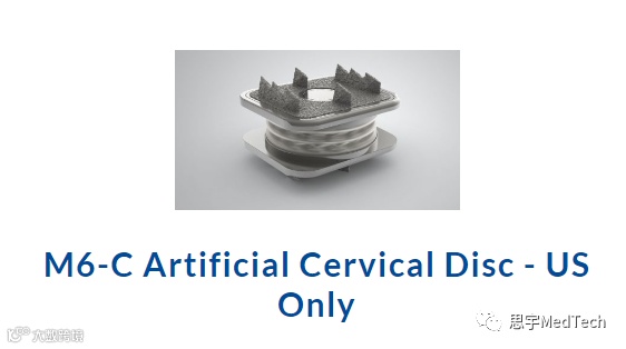 M6-C™ 人工颈椎间盘是帮助接受颈椎间盘置换术的患者保持运动的设备。M6-C™旨在模仿患者的天然椎间盘,M6-C™也是唯一一款包含人造核(由聚碳酸酯聚氨酯制成)和编织纤维环(由聚乙烯制成)的人造椎间盘,该设计旨在提供与自然椎间盘相同的生理运动特性,包括压缩能力和受控的运动范围。M6-C™配有两个带有龙骨的钛涂层外板,用于将椎间盘固定在椎骨上,从而在骨骼中长期固定并保持稳定。一项关于M6-C™人工颈椎间盘的器械豁免调查(IDE)研究显示,患者的颈臂疼痛和生活质量均有显著改善。FDA在决定批准M6-C™时使用了该项研究结果。自2006年以来,M6-C™已在欧盟和其他国家上市。