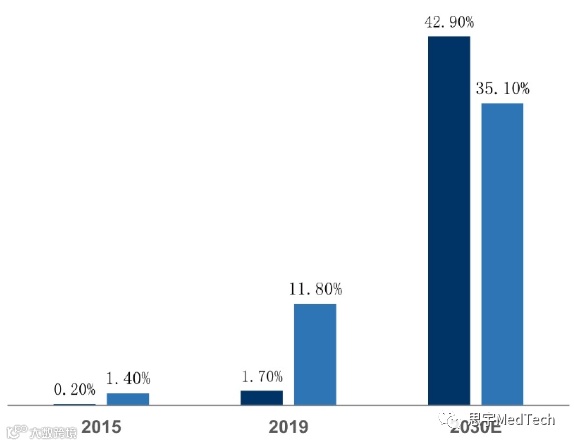 根据Fortunes Business Insight数据,全球神经介入市场2018年达到22.6亿美元,预计2026年将达到42.8亿美元,CAGR为8.3%。2019年,美国神经介入手术中的取栓术普及率达到11.8%,中国只有1.7%,整体渗透率也只有2.3%。但这不意味着中国神经介入手术的普及缓慢。从2015年到2019年,中国神经介入手术数量,从4.29万台增加到12.41万台,年复合增长率为 30.4%,随着脑卒中等疾病的增长,预计这个数字会在2030年增加到215万台。渗透率可达35.8%。