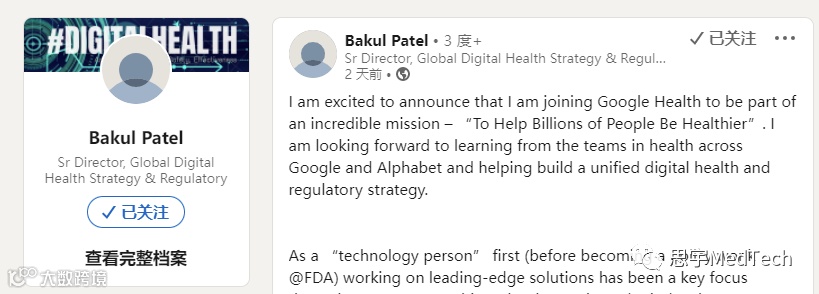 2022年5月18日,据美国媒体报道,前 FDA 全球战略与创新首席数字健康官Bakul Patel入职谷歌,任谷歌健康全球数字健康战略和监管高级总监。