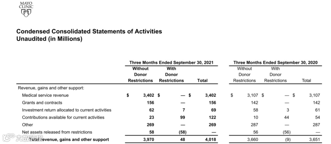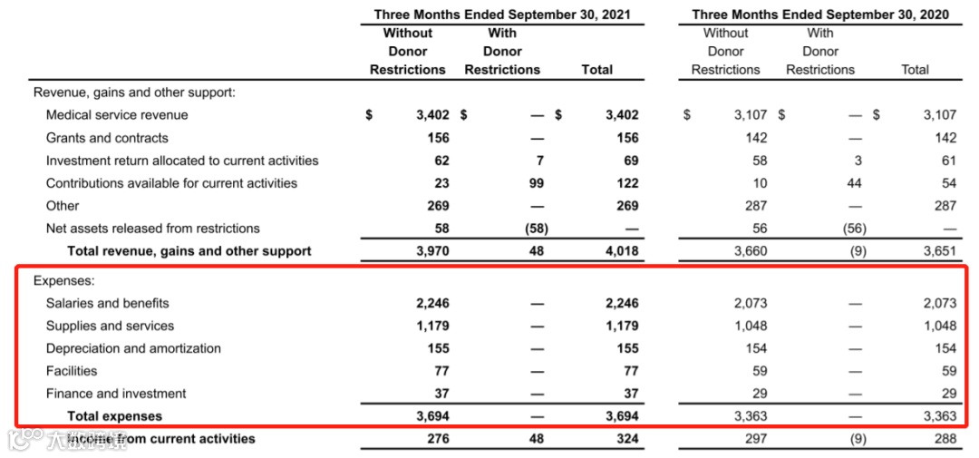 2021年官方宣布的第三个财务季度对比2020年同期增长明显,合计40.18亿美元。临床业务量的稳步回升帮助妙佑医疗国际实现了3.24 亿美元的净营业收入。所以大家不要以为非盈利医疗机构不赚钱,人家真的能赚钱,只是赚来的钱需要再投资到医疗产业、实验室、设备等,不得资本化而已。