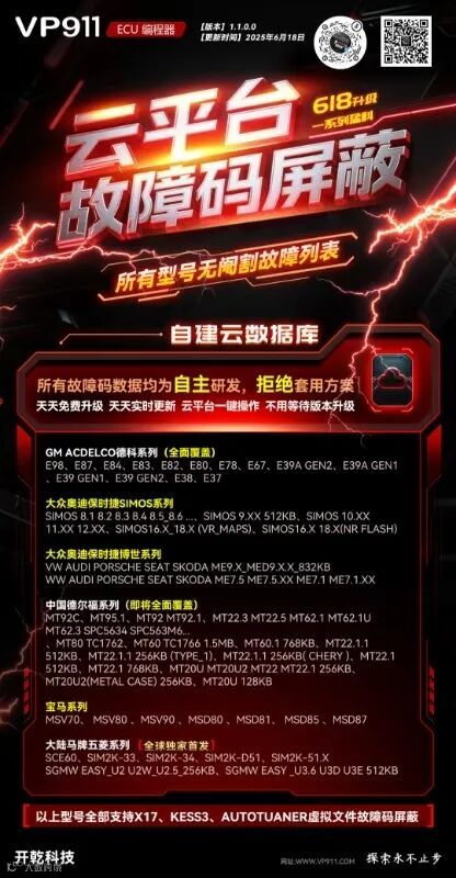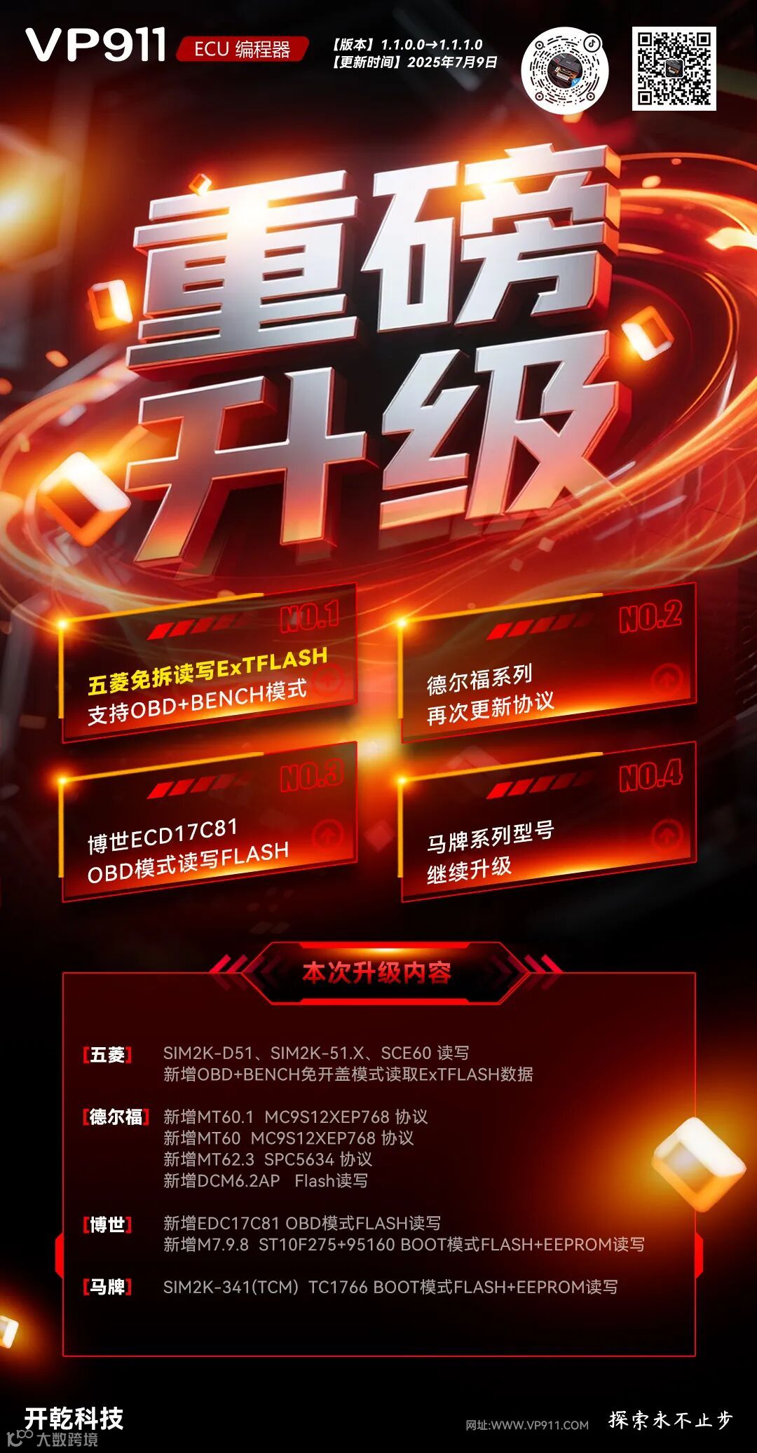 VP911 ECU编程器: 专注于行业痛点攻克,支持主流车型ECU/TCU数据读写、防盗关闭、动力升级、故障码屏蔽、怠速调校、一键OBD检查数据升级等。