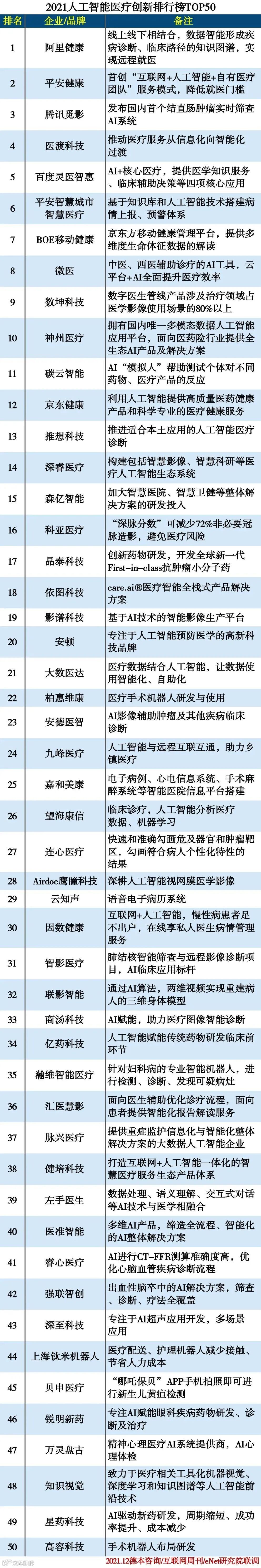 2021年底,德本咨询、《互联网周刊》等发布《2021 人工智能医疗创新 TOP50》榜单。阿里健康、平安健康、腾讯觅影位列前三。
