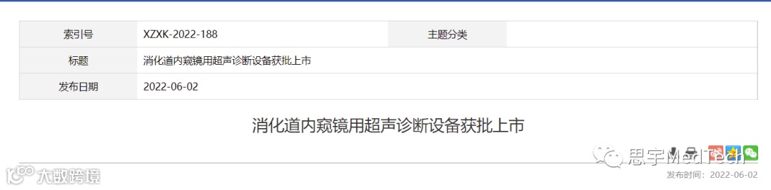 2022年6月2日,国家药监局更新消化道内窥镜用超声诊断设备获批消息,原文如下:
