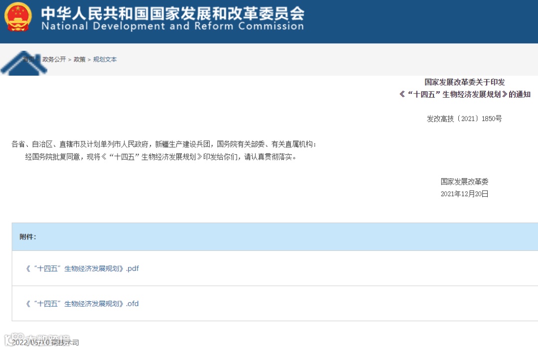 为系统谋划和整体推动我国生物经济高质量发展,国家发改委印发了《“十四五”生物经济发展规划》,这也是我国生物经济领域的首个顶层设计。今日上午, 国家发改委将召开发布会,介绍“十四五”生物经济发展规划有关情况。