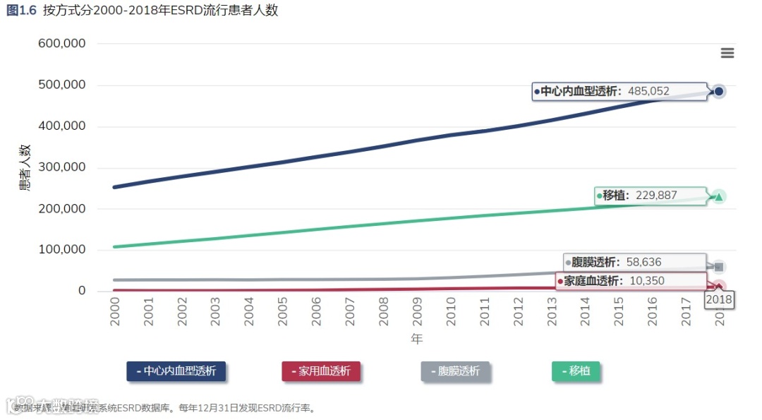 (图:美国ESRD患者采用的治疗模式,以中心式血液透析为主,远大于累积的肾移植患者,腹膜透析和家庭血液透析)