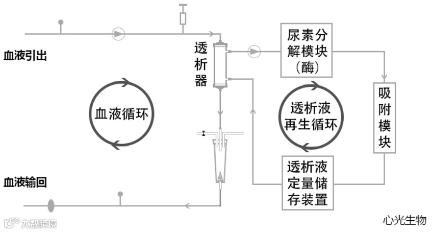 首款产品是心光自己研发的便携式血液透析机,它采用透析液再生技术,独立于水源,无需对家庭水源和电源进行改造。治疗以患者为中心,患者可以自由选择血液透析的场所和时间,包括家庭,旅行,出差或汽车上,这将极大地减少血液透析对患者生活和工作的影响,降低患者失业率。心光当前已完成原型机的设计,组装和三种大动物的可行性安全性测试。在耗材方面,心光自研的尿素代谢模块,大幅提升了脲酶的利用效率,降低酶用量10倍以上,并且能够重复使用,能够大幅降低耗材的核心成本,解决了Sorbent Dialysis当中关键的耗材成本问题,避免重蹈REDY和Renal Solution的覆辙。