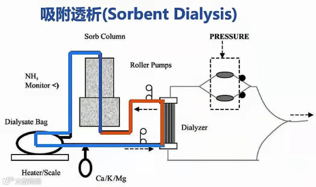 Sorbent Dialysis,即吸附透析,采用透析液再生系统,将透析后的透析废液,运用脲酶,磷酸锆,氧化锆和活性炭等清除里面的有害成分,产生的再生透析液重新用于血液透析。透析液再生能够有效降低纯水和水处理系统的需求,其所需的透析液只有2-6L,远低于一次性通过型所需要的120 L,而且小型便携,适合家庭环境,对患者的生活和工作影响较小。吸附剂也起到了细菌过滤膜的功效,有效降低感染率。