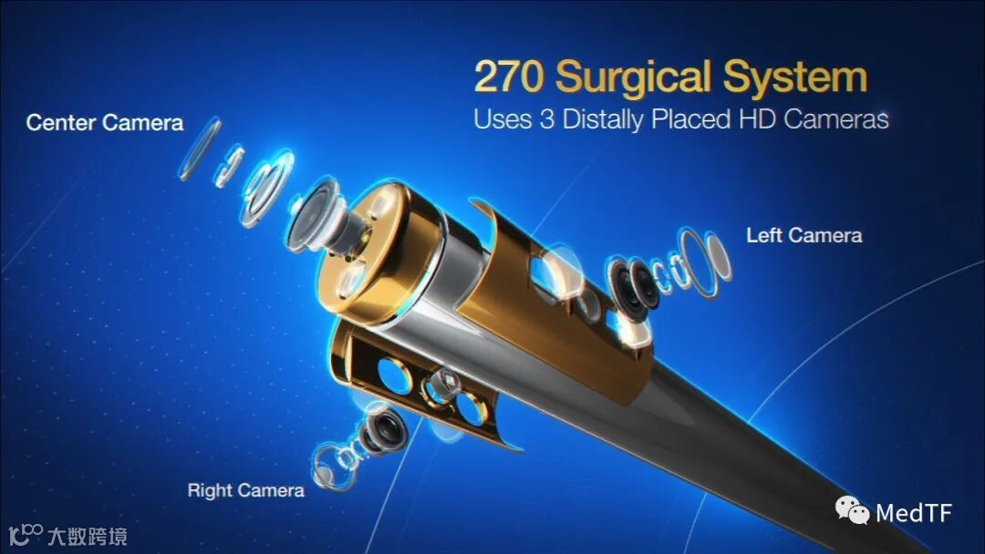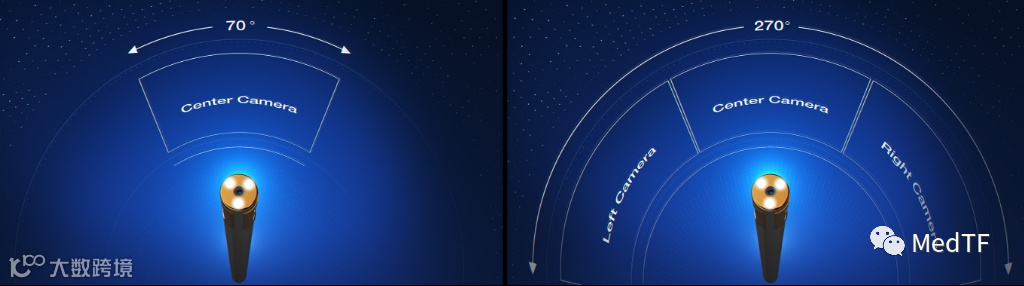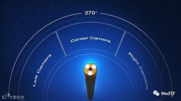 SurroundScope之所以能实现270°视场角,是因为SurroundScope在设置三个摄像头,分别为前置摄像头(与传统腹腔镜一致)、左摄像头、右摄像头。从而实现在手术中从传统模式(90°视场角)随意切换到270°视场角,因可以可减少腹腔镜的移动,从而实现更平滑、更稳定的手术过程,使得手术时间降低为传统腹腔镜一半。