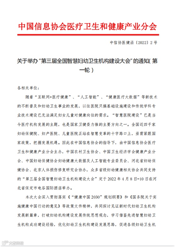 随着“互联网+医疗健康”、“人工智能”、“健康医疗大数据”等新技术的不断普及和妇幼卫生事业的发展,以往医院只搞基础设施建设和传统学科专业技术建设已无法满足妇女儿童对健康向往的需求。“智慧医院建设”已是当今医疗机构发展的主题,也是国家卫健委力推的主要方向之一。全国近四千家妇幼保健院、妇产医院、儿童医院正站在智慧变革的十字路口上,亟需紧跟国家政策,把握发展机遇。因此,由中国信息协会的指导,中国信息协会医疗卫生和健康产业分会主办,中国农村卫生协会、中国卫生经济学会健康产业分会、中国妇幼保健协会妇幼健康大数据及人工智能专业委员会、河北省妇幼保健协会、北京人体损伤修复研究会协办,众多省级妇幼健康相关协会共同支持的“第三届全国智慧妇幼卫生机构建设大会”,将于2022年4月8-10日在河北省保定市电谷国际酒店隆重举办。
