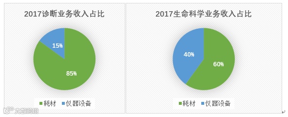 其实IVD行业包括仪器和耗材(包含试剂)。根据17年年报显示,生命科学和诊断业务的收入大部分来自于耗材而非仪器设备,这和其他三个巨头一样。2017年生命科学业务收入中耗材占60%,诊断业务中耗材占高达85%(如下图)。由此可以看出,耗材在诊断业务中的重要性。