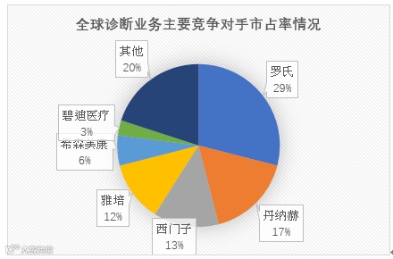 体外诊断(In Vitro Diagnostic,简称 IVD) 是指在人体之外通过检测人体的样本(如血液、体 液、组织等)而获取临床诊断信息的产品和服务。在全球IVD领域,丹纳赫主要的竞争对手有瑞士罗氏,美国雅培,德国西门子,法国生物梅里埃,日本希森美康,美国碧迪医疗等,主要竞争对手们最新的市占率如下图所示: