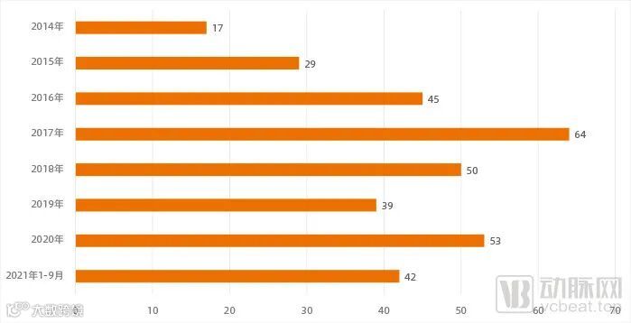 根据动脉网的统计,截至2021年9月23日,共有346款医疗器械进入了创新医疗器械审批程序。2017年曾有64款创新医疗器械进入审批程序,是迄今为止的巅峰。