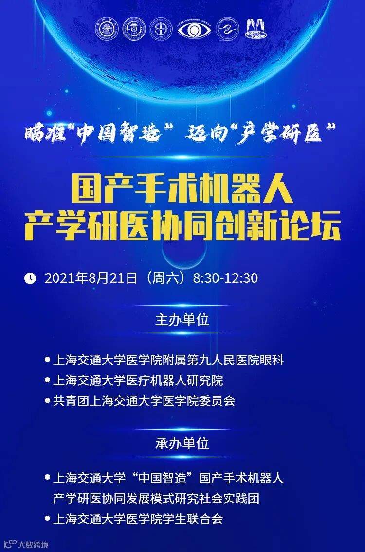 为了更好地推进手术机器人等医疗前沿技术领域的发展,向相关的医务工作者、工程师以及日后有志向投身于该事业的高校学子分享目前国产手术机器人行业的现状与发展趋势,在上海交通大学医学院附属第九人民医院眼科、上海交通大学医疗机器人研究院、共青团上海交通大学医学院委员会的指导和支持下,“中国智造”国产手术机器人产学研医协同发展模式社会实践团和上海交通大学医学院学生联合会发起举办“瞄准‘中国智造’,迈向‘产学研医’——2021国产手术机器人产学研医协同创新论坛”。会议将关注我国国产手术机器人的研发、生产和应用等诸多问题,邀请领域内诸多专家大咖聚焦手术机器人产业最新进展和未来发展,重视学科交叉、开放交流观点,为对国产手术机器人感兴趣的广大师生及社会各界人士提供认识了解这一行业的机会,从而助力推动国产手术机器人“中国智造”宏伟愿景的实现。