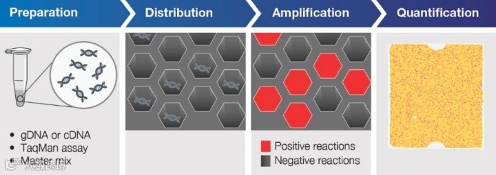 将核酸样品分配到大量独立、平行的微反应单元(纳升级)中,部分反应单元包含靶标分子(阳性),而其他不包含(阴性),接着进行扩增,并利用TaqMan化学试剂或染料标记探针检测靶标序列,能够实现靶标分子的绝对计数。 |