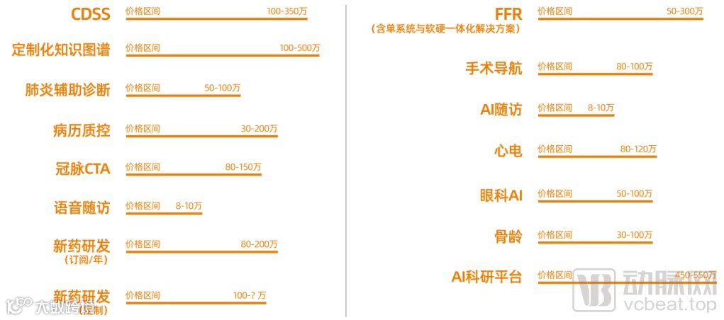 从数据可知,医疗IT类应用,如病历质控、CDSS、人工智能科研平台等客单价相对较高,软件类采购价值在100-350万不等,且需求较大;影像服务类人工智能类价格在30-150万区间,多聚集于100万左右。