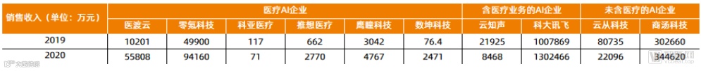 尽管规模存在差异,但医疗人工智能公司在近两年的营收大多存在数倍提升。表中的医渡科技、零氪科技外,影像类人工智能企业推想医疗、数坤科技的销售收入也在2021年前段发生了数倍提升。